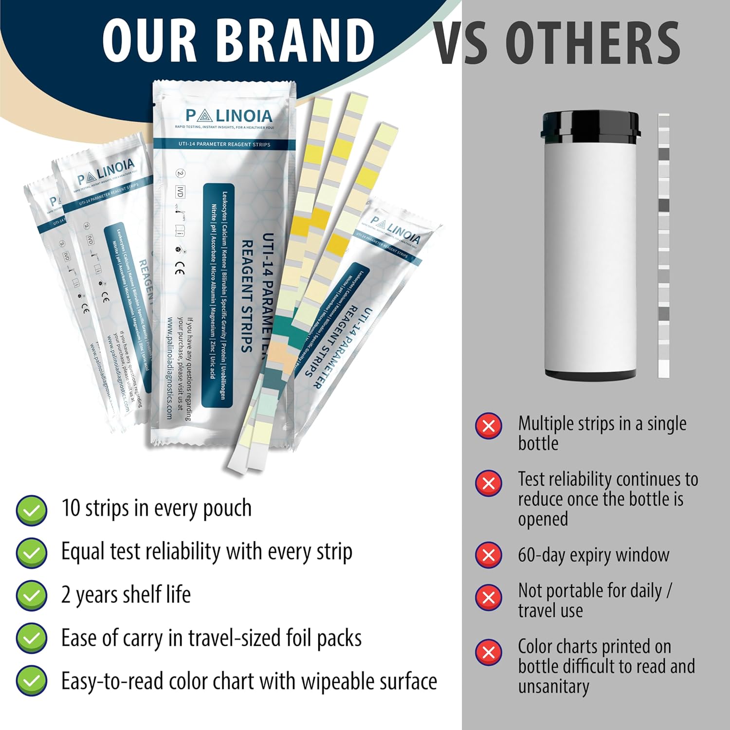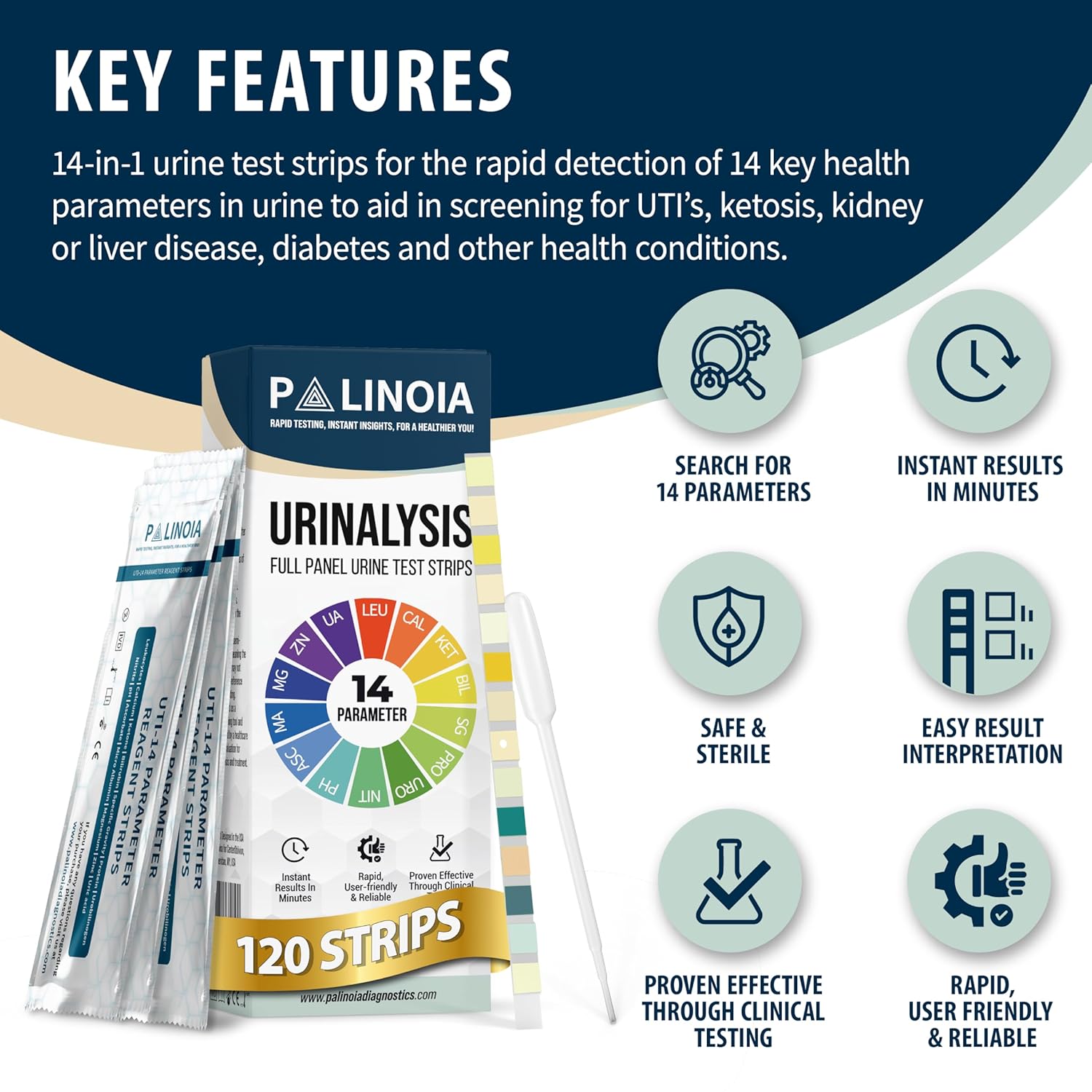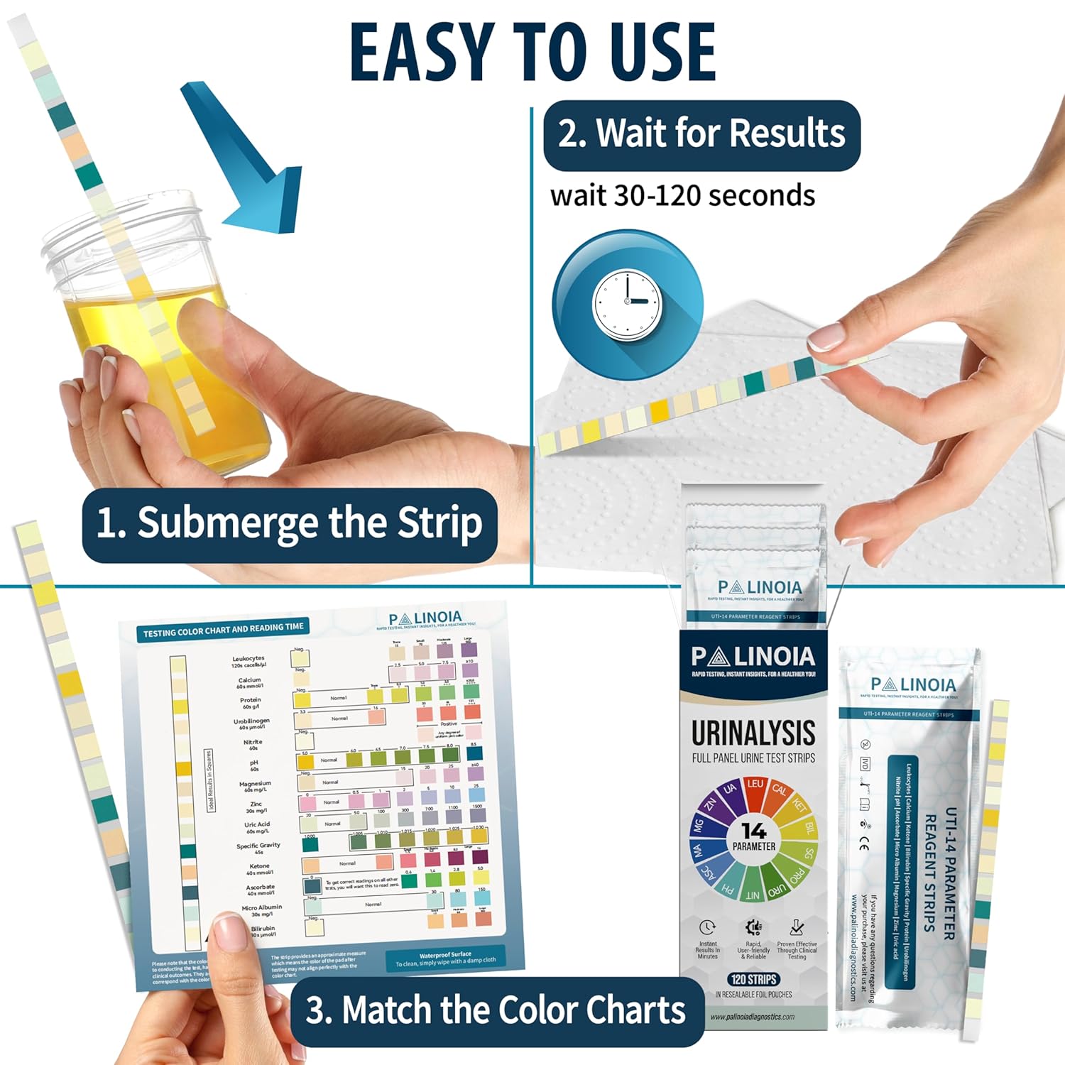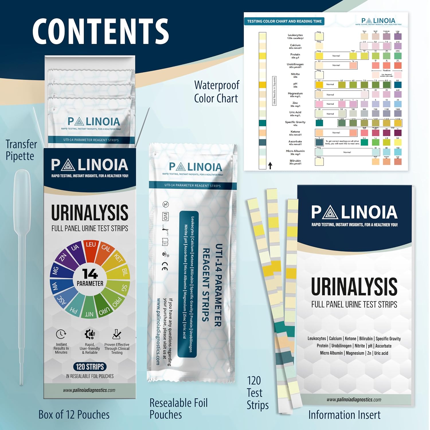 14-in-1 Full Panel Urine Test Strips for Urinalysis | 120 Strips in Resealable Pouches – Test for Kidney Health, Liver Function, UTI, Ketosis, Hydration, and Protein Levels