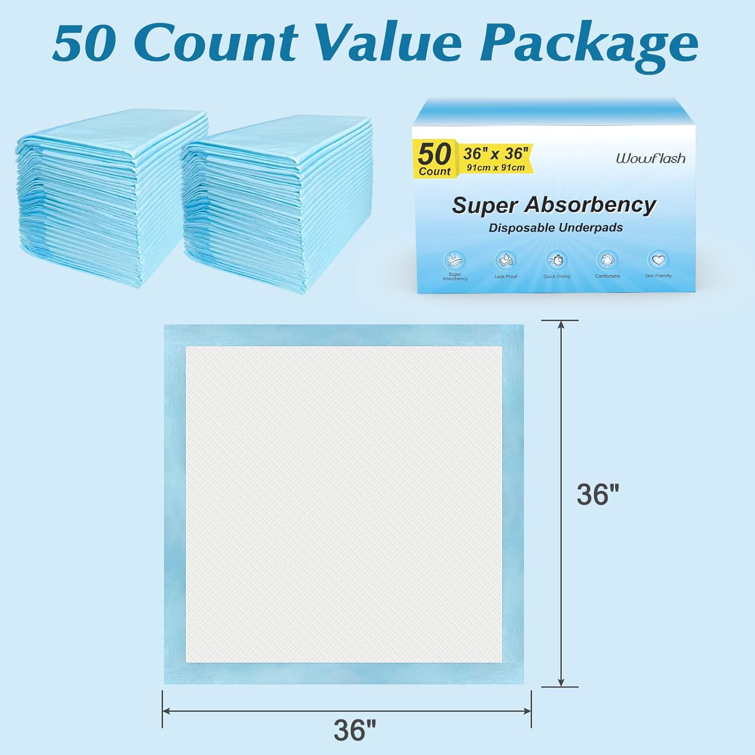 50 Count 36″ x 36″ Super Absorbency Disposable Underpads – Leakproof Quick Drying Pads for Baby, Puppy & Adults, Bed Pads, Incontinence & Dog Pee