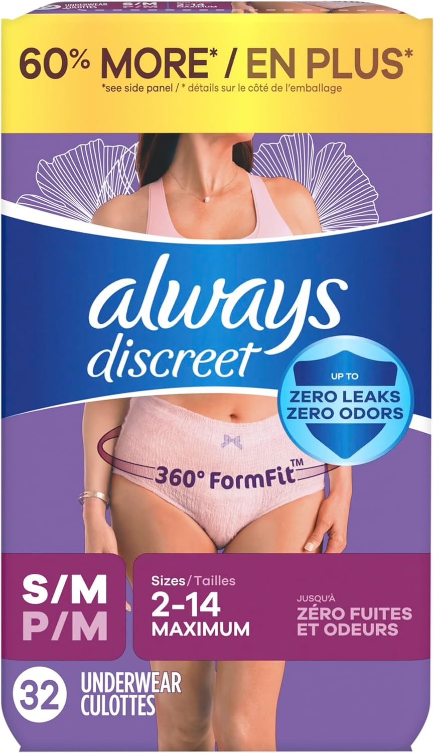 Always Discreet Adult Diapers for Women, Incontinence Underwear, Postpartum Essentials, Disposable Briefs, Max Absorbency, Bladder Leak Protection, Small/Medium, 32ct
