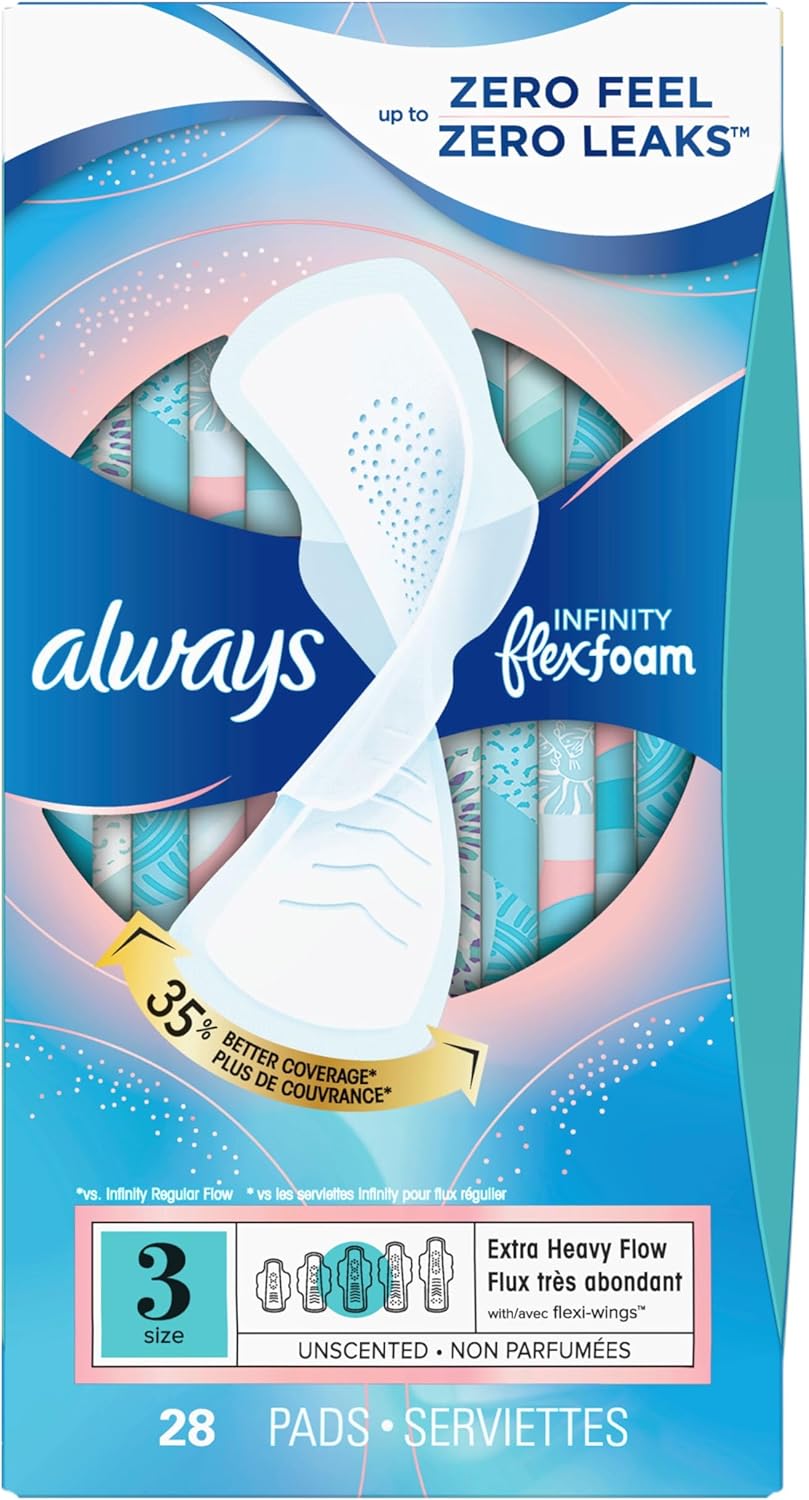 Always Infinity Feminine Pads for Women, Flexfoam Pads with Wings, Size 3, Extra Heavy Absorbency, Unscented, 84 Count (3 Packs of 28)