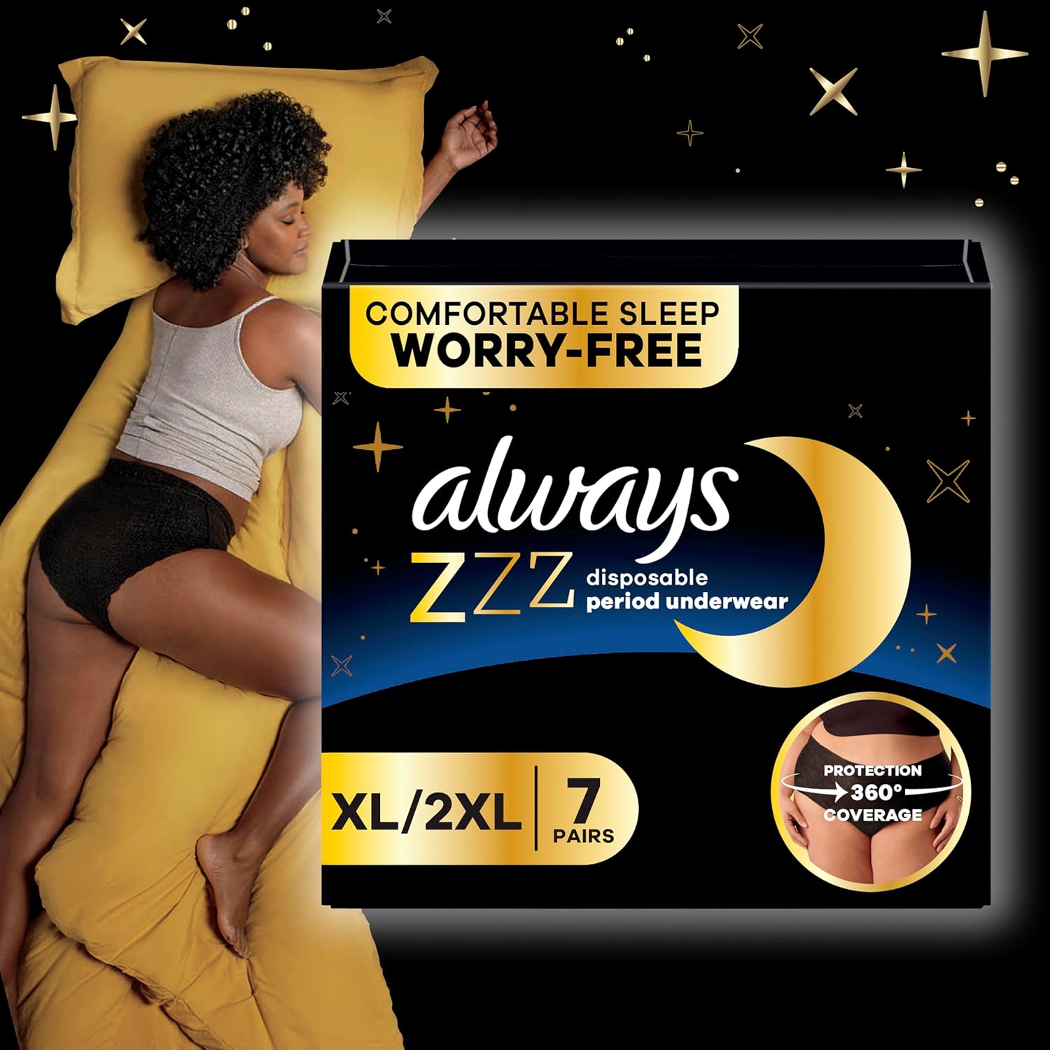 Always ZZZ Overnight Disposable Period Underwear for Women Extra Large/2LX, 360° Coverage for Worry-Free Nights, 14 Count (2 Packs of 7)