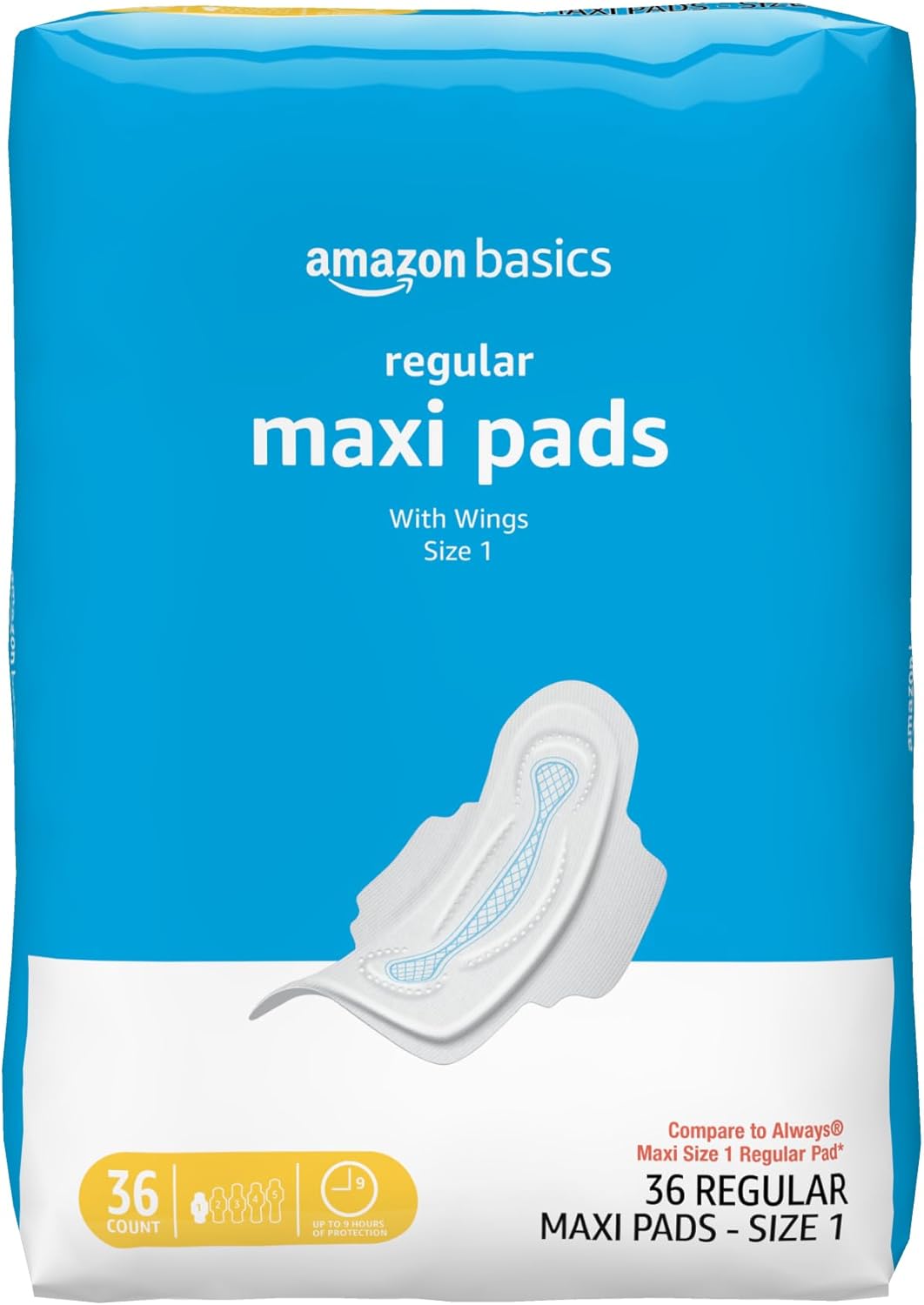 Amazon Basics Thick Maxi Pads with Wings for Periods, Regular Absorbency, Feminine Pads, Unscented, Size 1, 36 Count