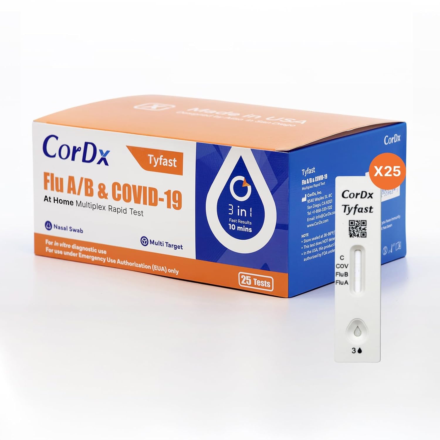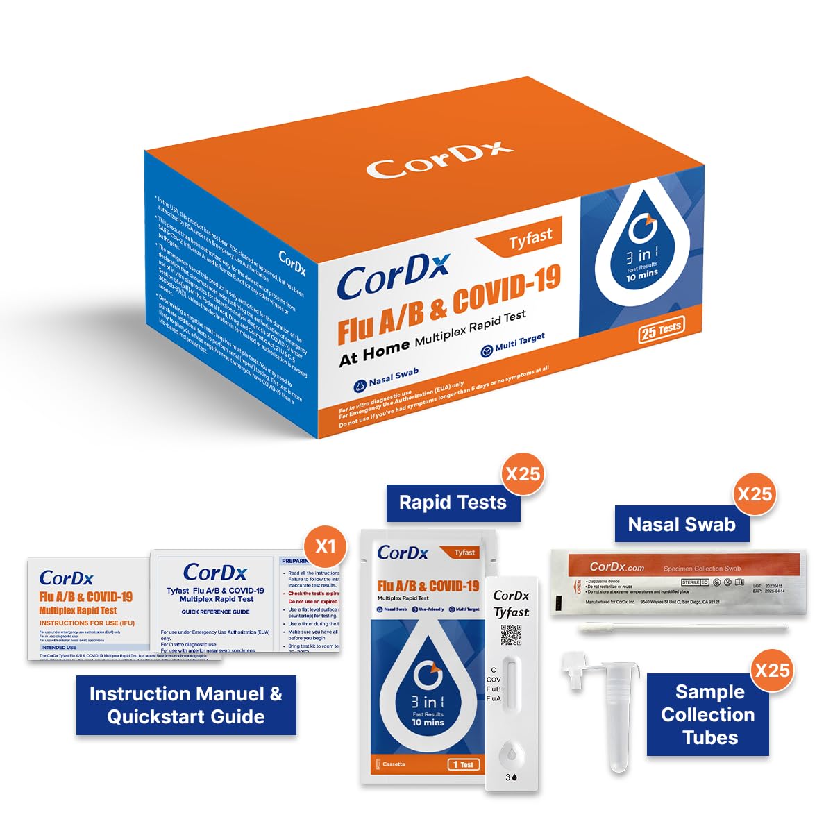 CorDx TyFast at Home Flu A/B & COVID-19 Multiplex Rapid Test Kit, Easy, Accurate, Fast Results in 10 Minutes, 3 in 1 Combo Kit, 25 Tests