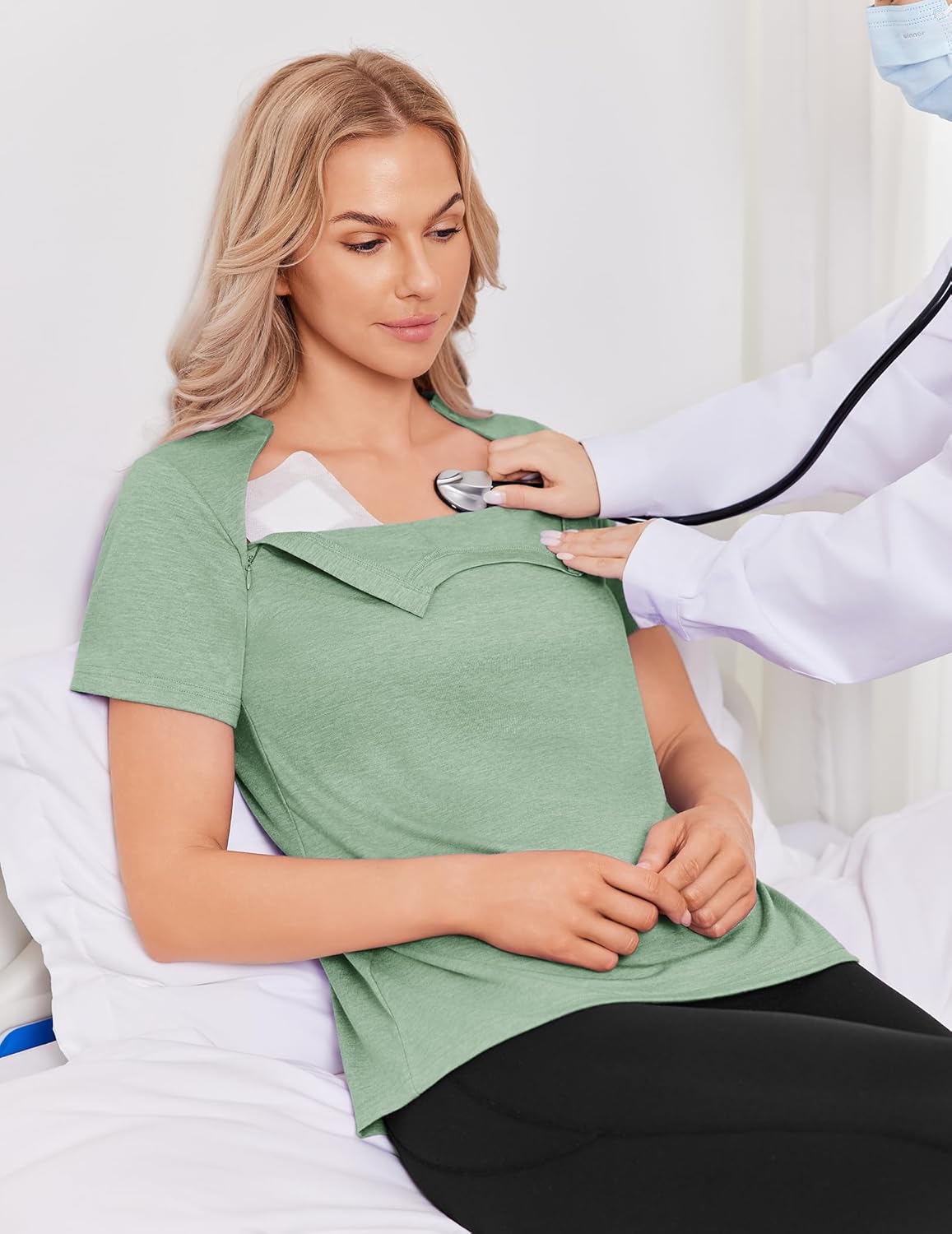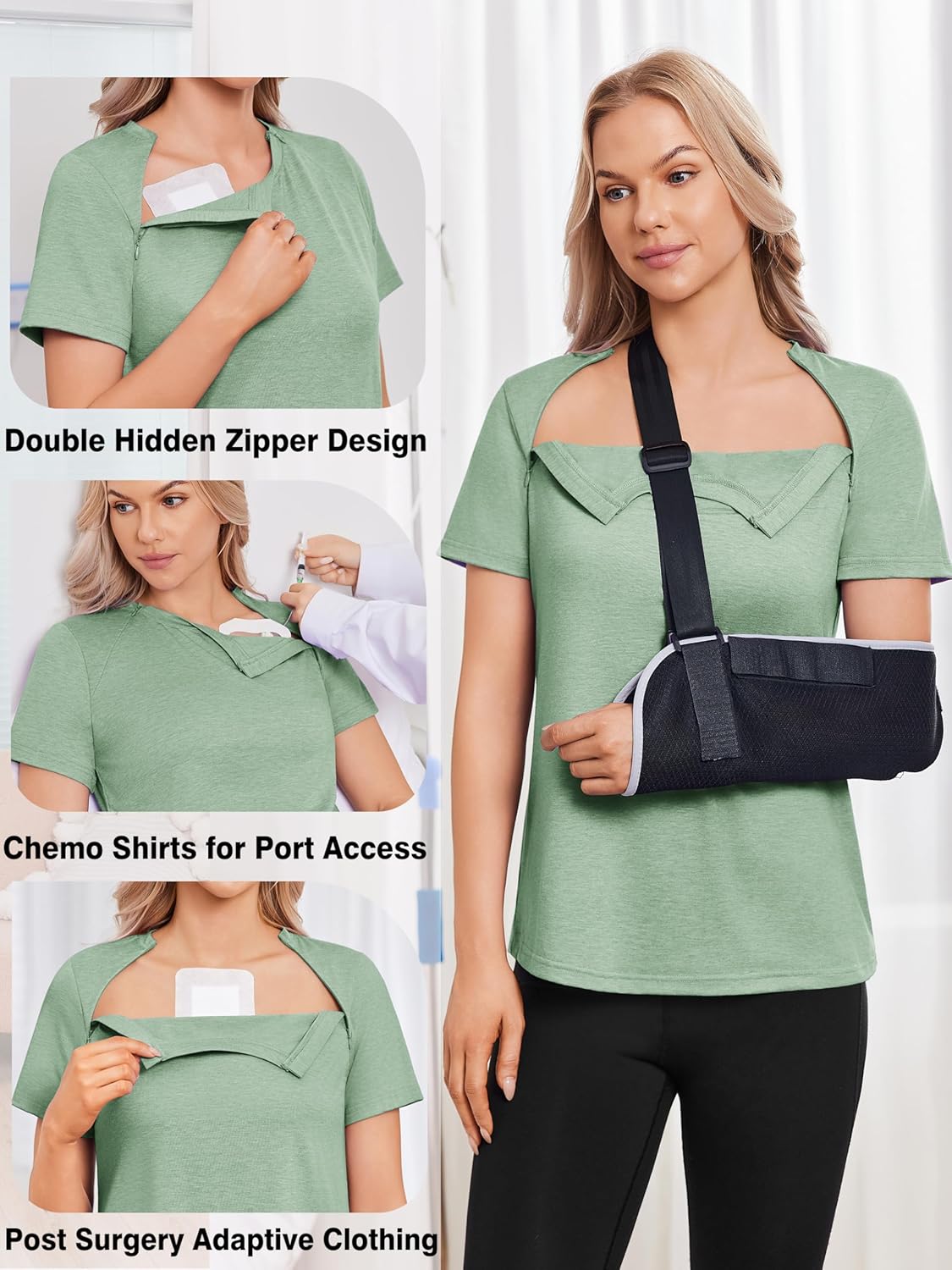 Deyeek Chemo Shirts for Port Access Women with 2 Hidden Side Zippers Post Surgery Short Sleeve Tear Away Adaptive Top Tees