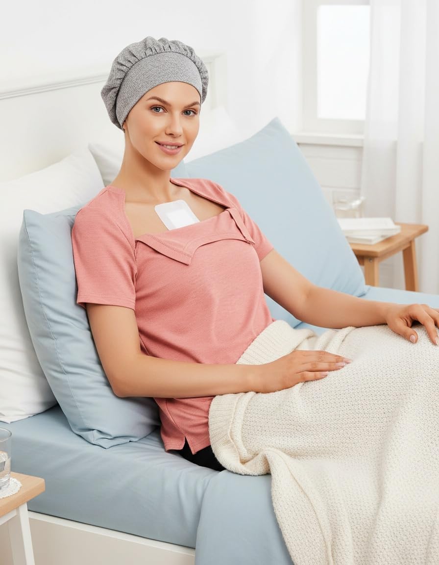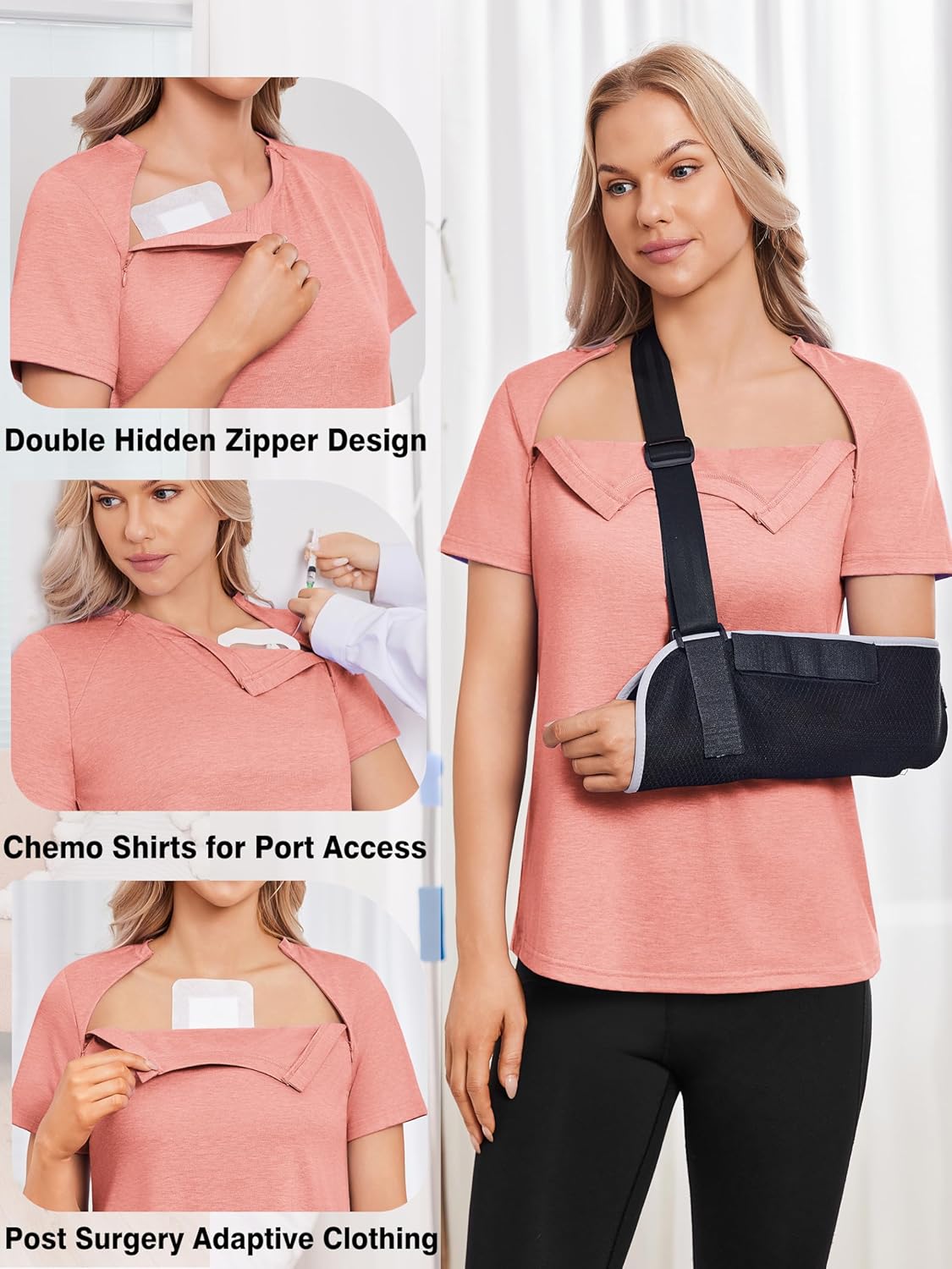 Deyeek Chemo Shirts for Port Access Women with 2 Hidden Side Zippers Post Surgery Short Sleeve Tear Away Adaptive Top Tees