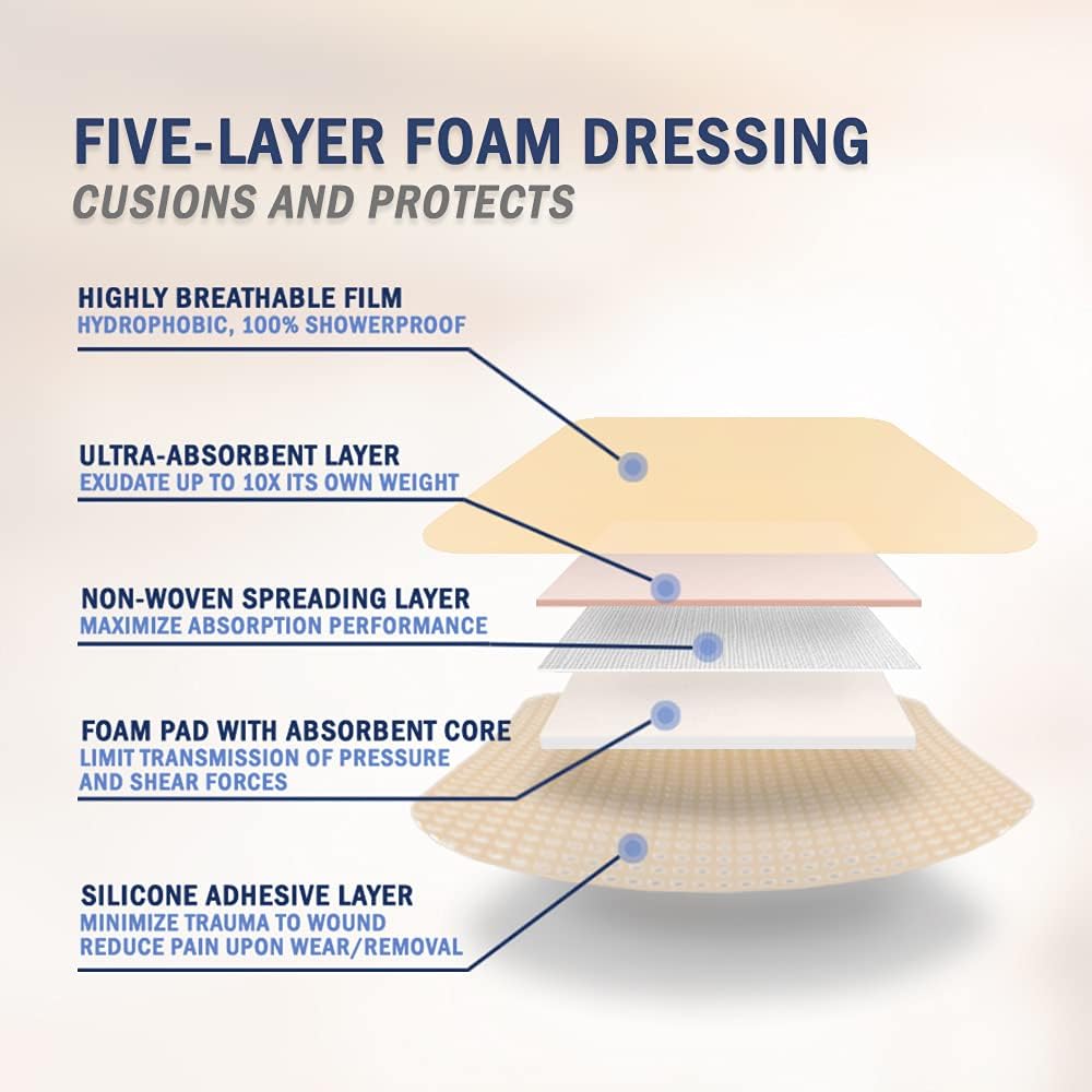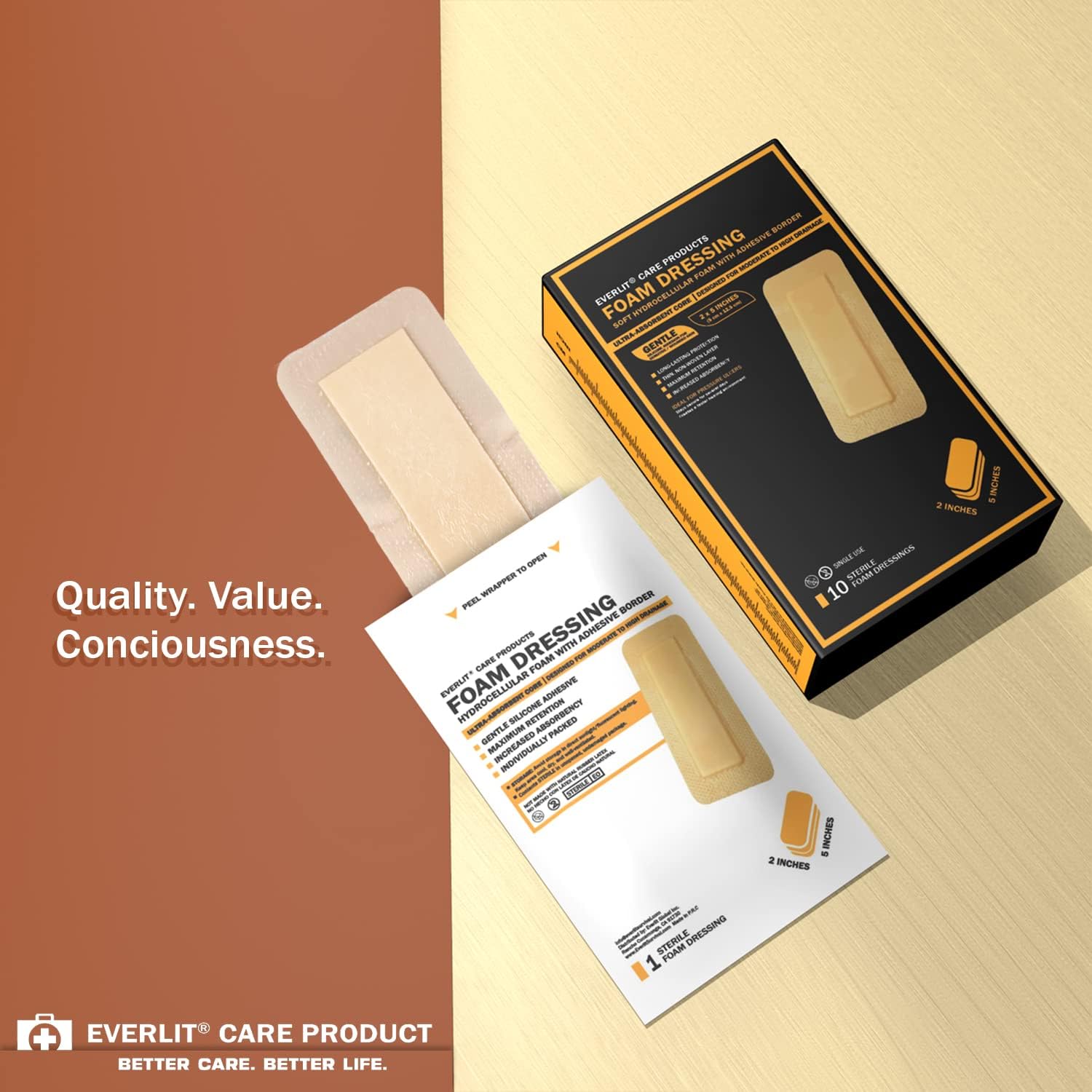 EVERLIT Care Silicone Foam Dressing with Adhesive Border | Highly Absorbent Hypoallergenic Bandages for Chronic Wounds, Bed Sores, Pressure Ulcers | Gentle & Secure Adhesion (2″ x 5″ | 10 Pack)