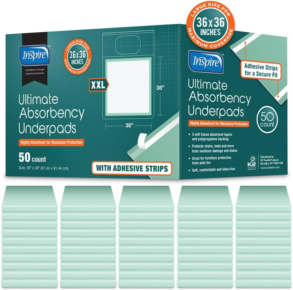 Inspire Super and Ultra Absorbent Disposable Bed Pads, 36″ X 36″, Pack of 50 with Adhesive, XXL