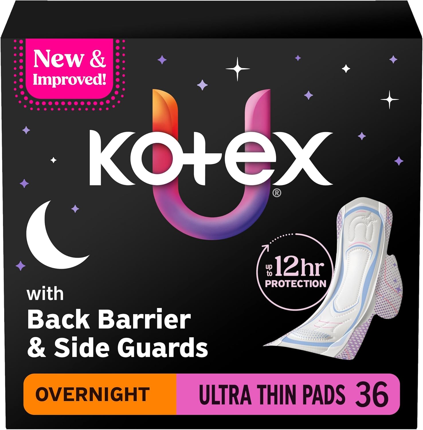 Kotex Ultra Thin Overnight Pads with Wings, Heavy Absorbency, 36 Count (Packaging May Vary)