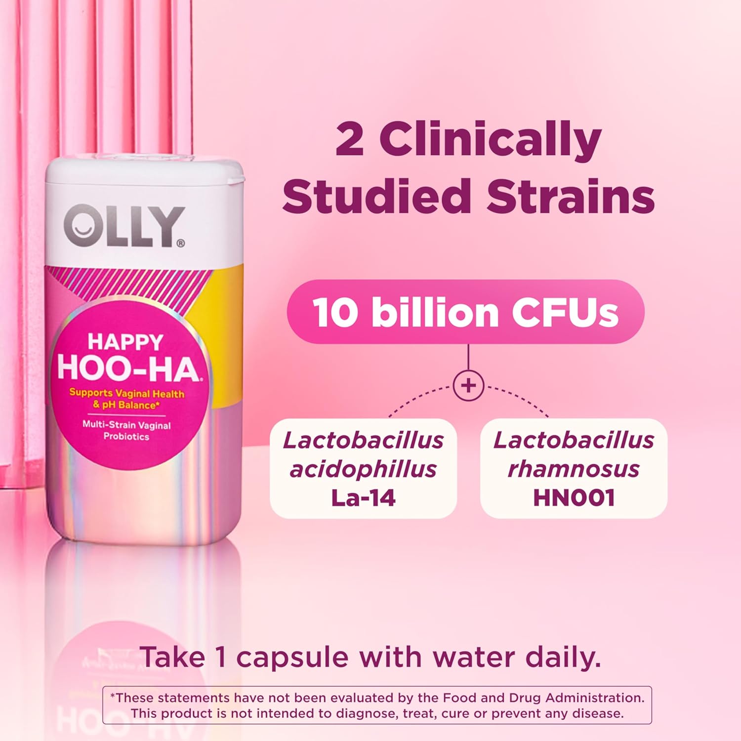 OLLY Happy Hoo-Ha Capsules, Probiotic for Women, Vaginal Health and pH Balance, 10 Billion CFU, Gluten Free – 25 Count