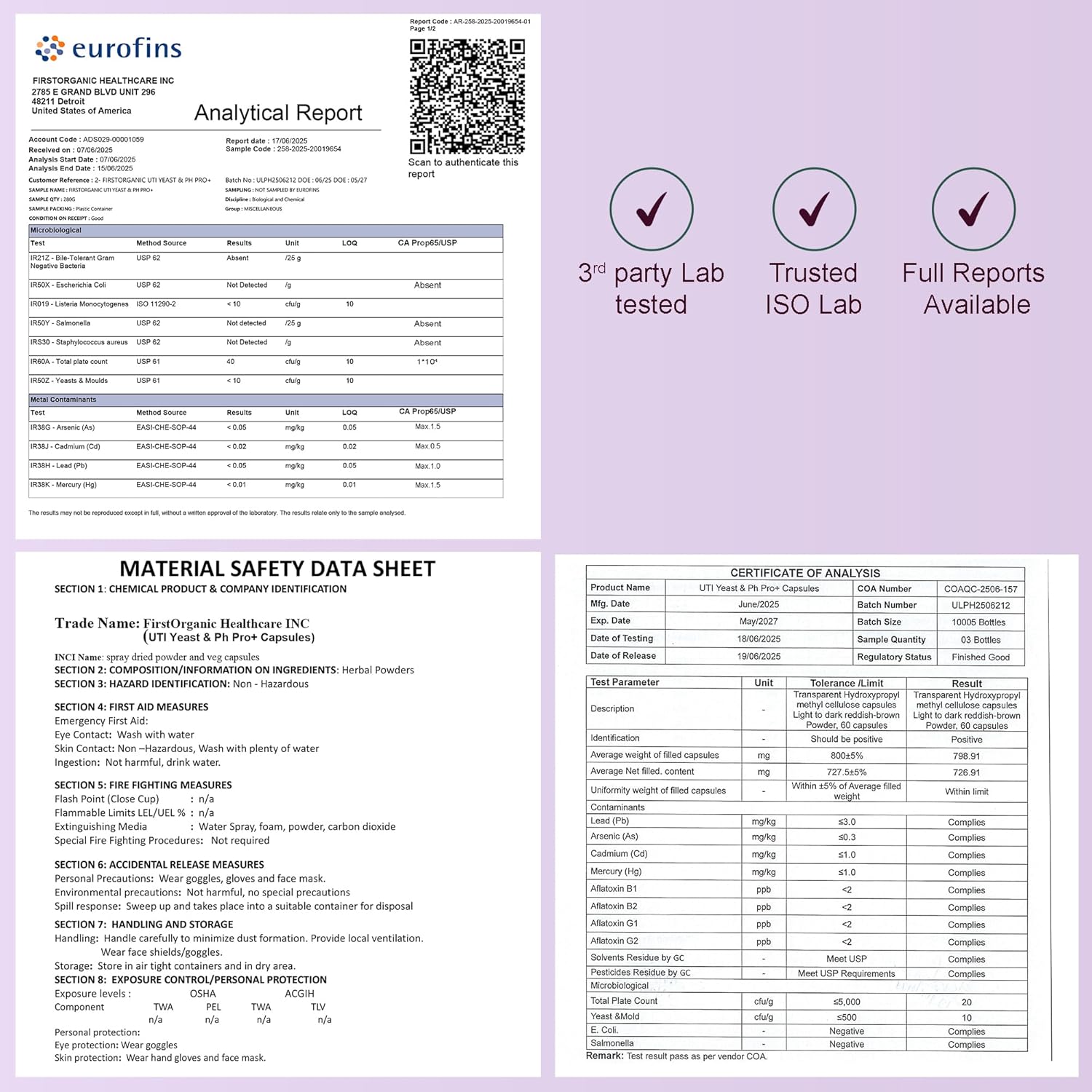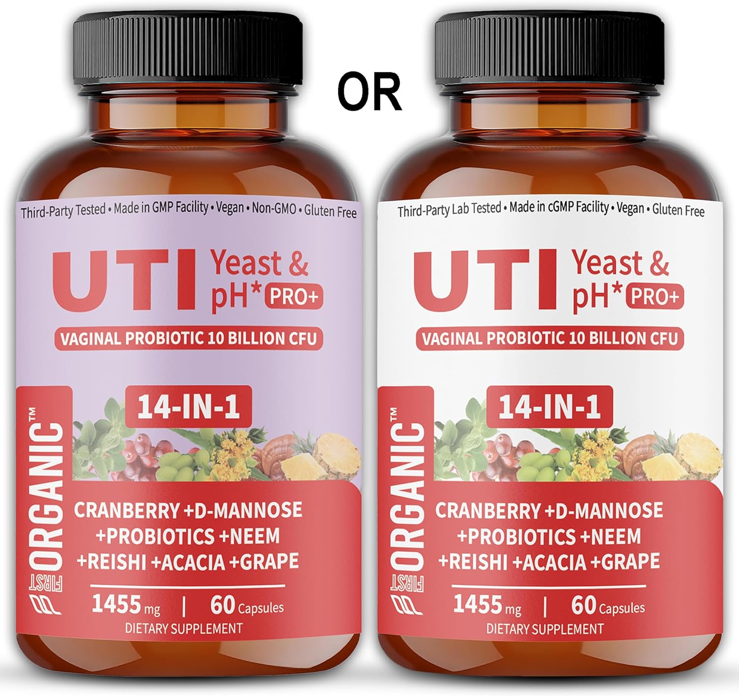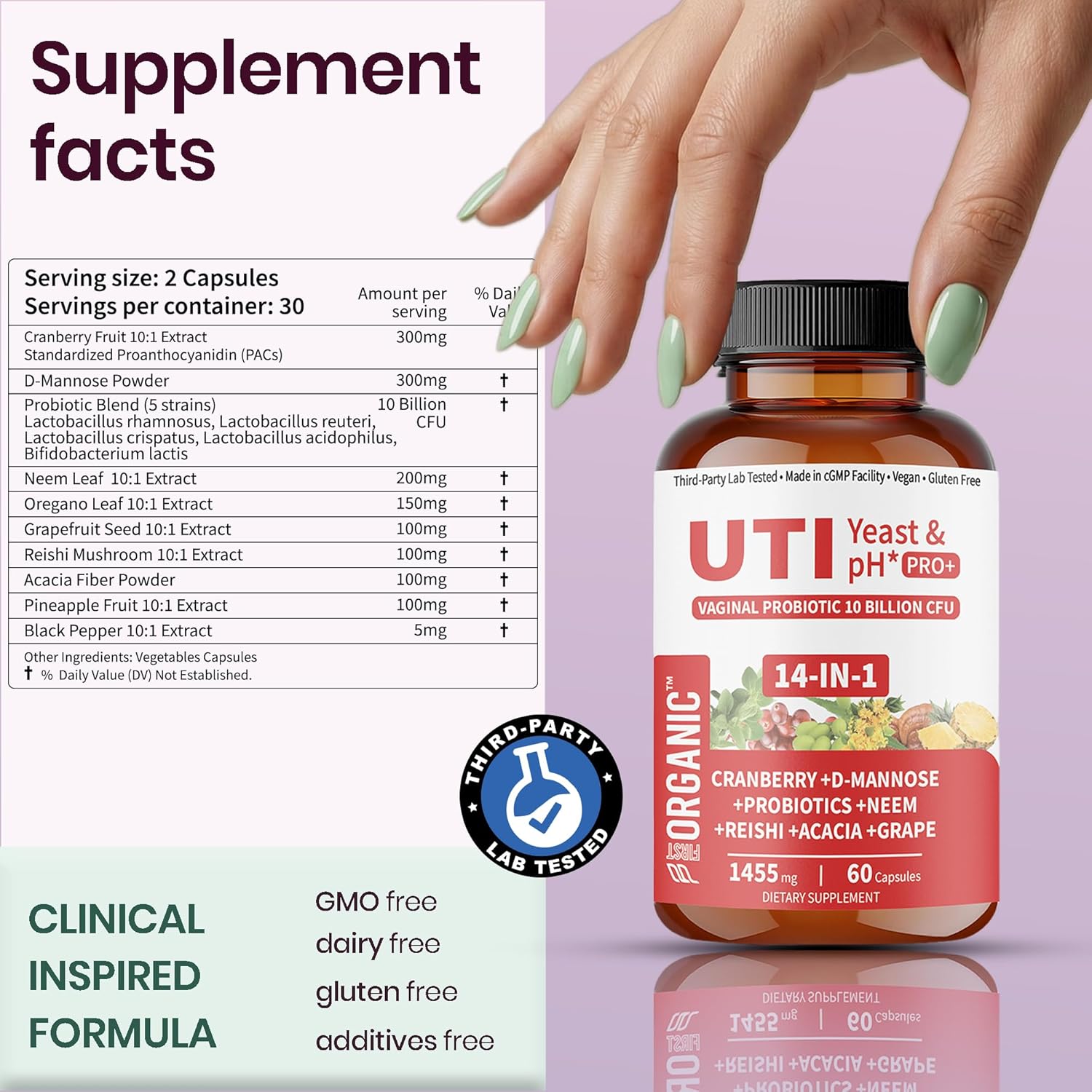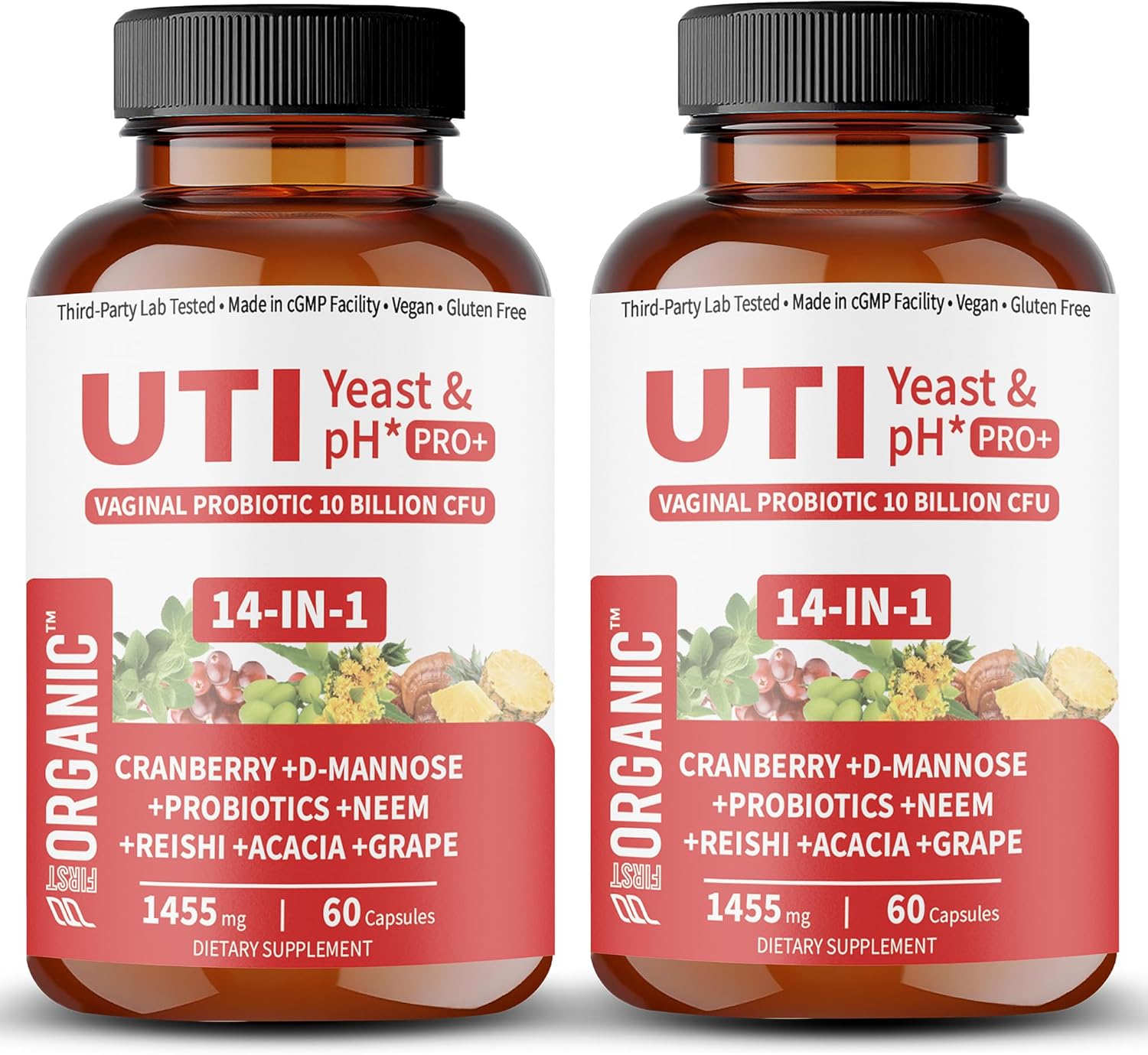 UTI Yeast & pH Pro+ | Pack of 2 | Daily Feminine Hydration & Balance Support with Cranberry, D-Manose, Aloe, Hibiscus | Third-Party Tested, cGMP Facility, Vegan, Gluten-Free | 60+60 Caps